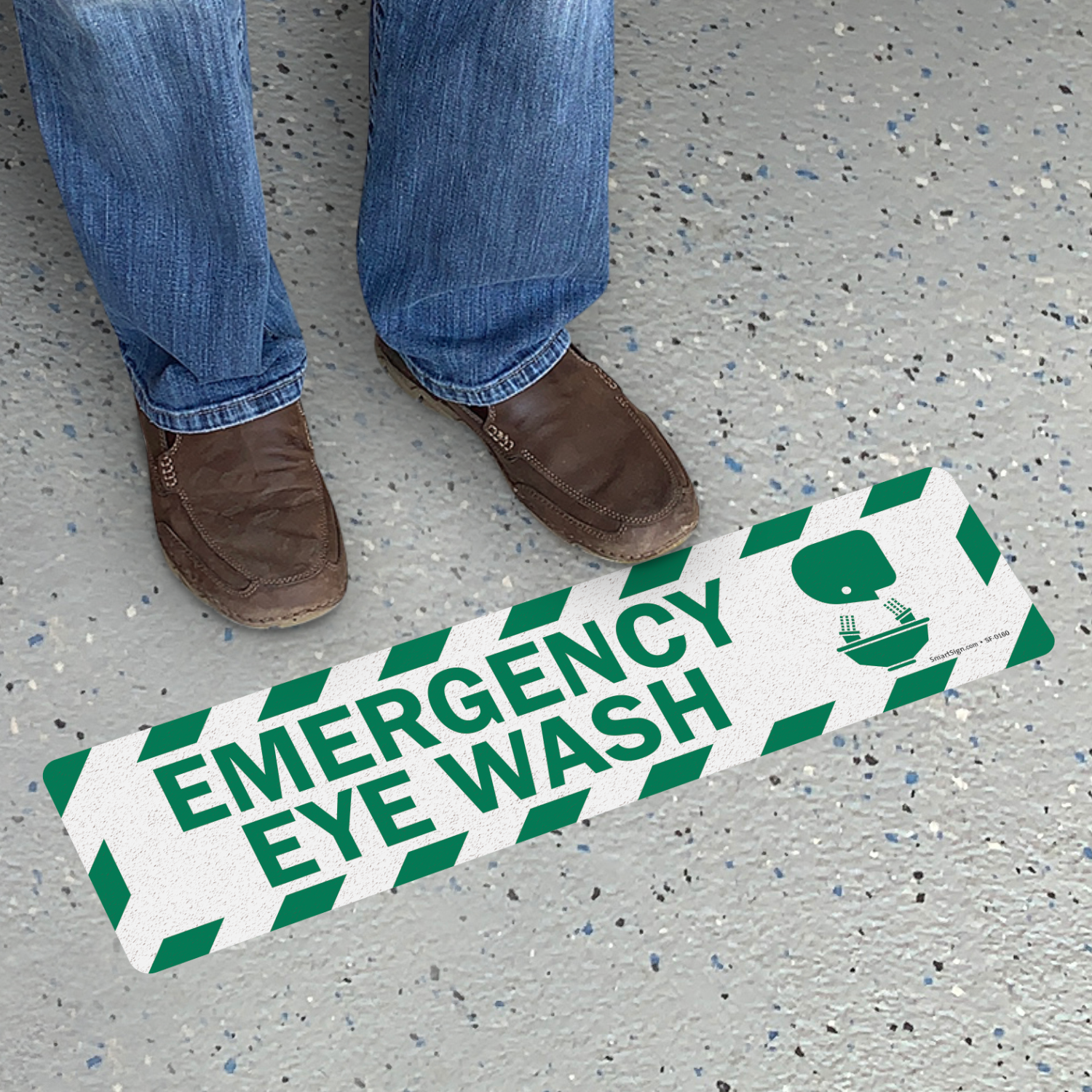 Display this Emergency Eye Wash Sign with graphic on your floor to show everyone where they should go in an emergency. This rectangular floor sign will always stand out due to its border.