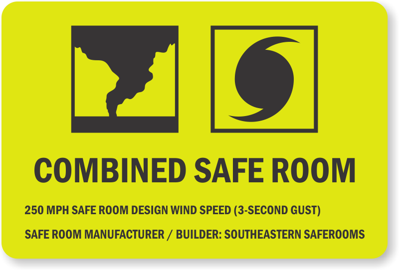 Provide pertinent details of your Combined Safe Room with a custom sign. Add wind speed and builder name to this template to personalize it. Sign is designed to meet FEMA regulations in Chapter 361 and ICC 500 Sec 108.