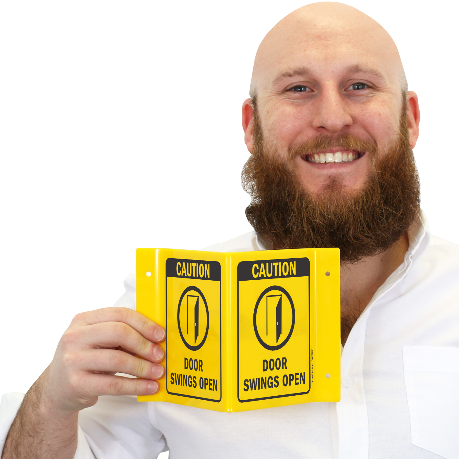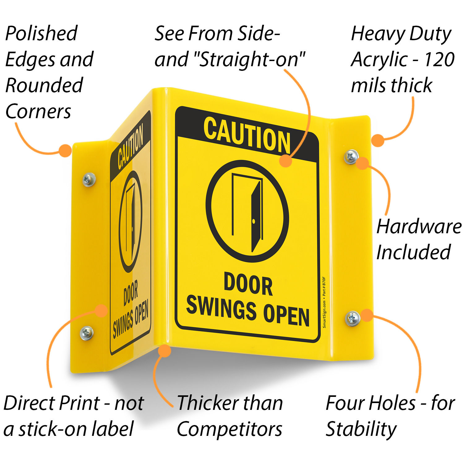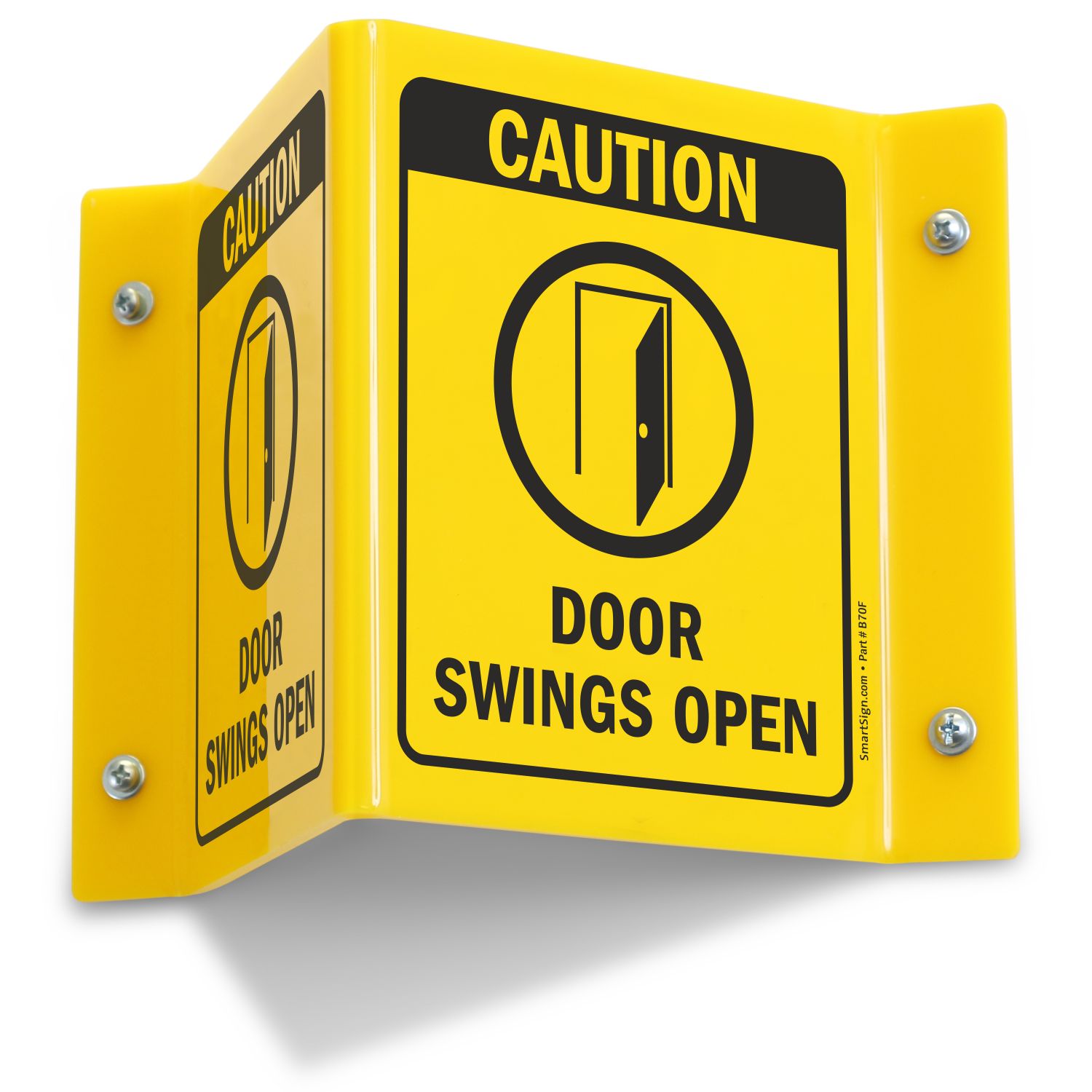 Use a "caution doors swings open (with symbol)" sign. Improve for your next inspection!