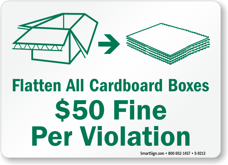 Recycle Sign: Flatten All Cardboard Boxes $50 Fine Per Violation (With Graphic) S-9213