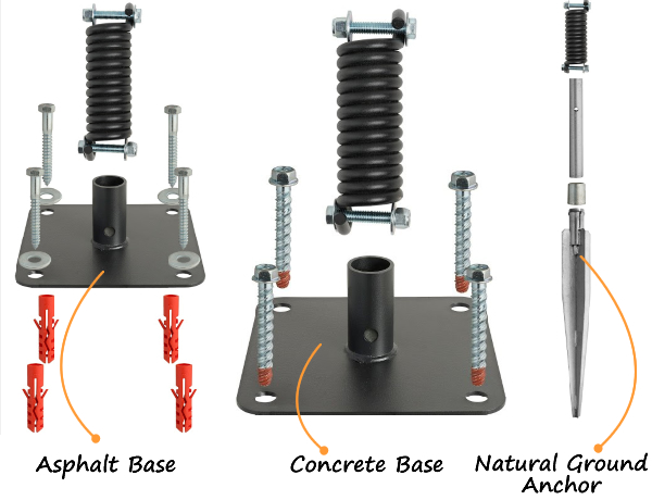 - Includes hardware for concrete, asphalt, and natural ground surfaces.
