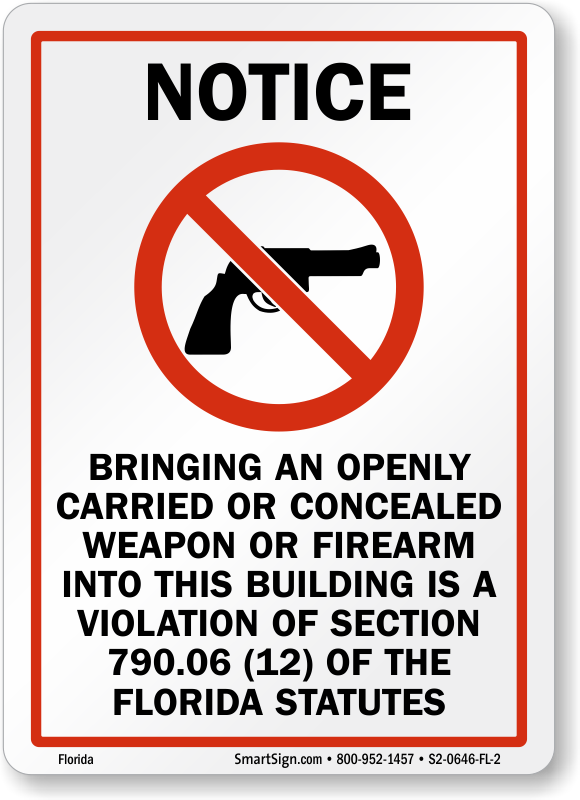 This Florida No Open or Concealed Carry Gun Sign is great for police stations, highway patrol stations, sheriff's office, prisons, detention facilities, jails, courthouses, polling places, schools, colleges, events, career centers, or any place of nuisance, etc. mentioned in Section 790.06 (12) of the Florida Statutes.