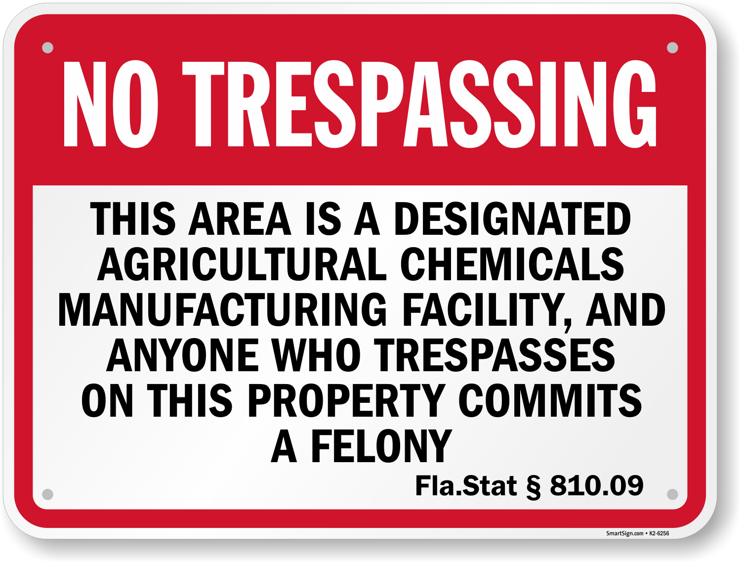 Official Florida No Trespassing Sign: This Area Is A Designated Agricultural Chemicals Manufacturing Facility, And Anyone Who Trespasses On This Property Commits A Felony - Fla.Stat § 810.09 K2-6256