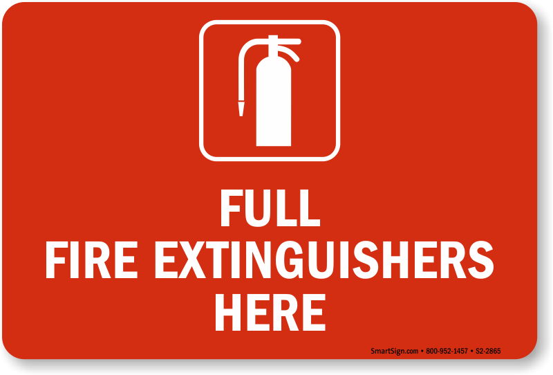 Bright red signs are impossible to miss out. Graphic used on the sign is universally recognized as a fire extinguisher and message 'Full Fire Extinguishers Here' is as clear as it gets.