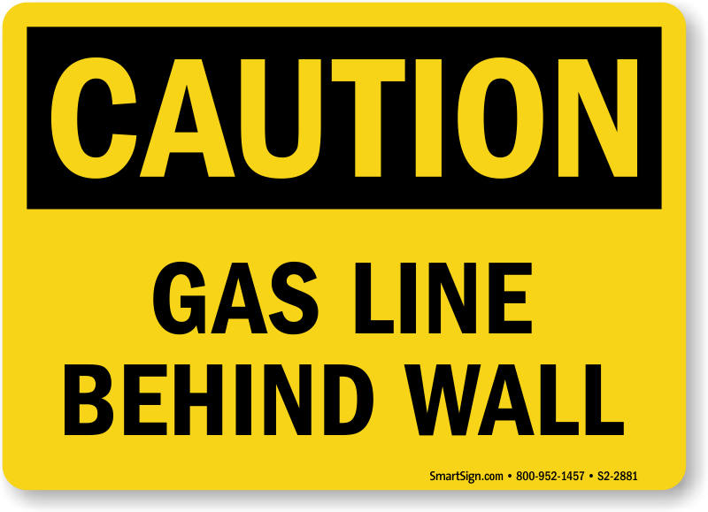 OSHA Caution Sign makes sure no one damages the gas line behind the wall while repairing the wall.