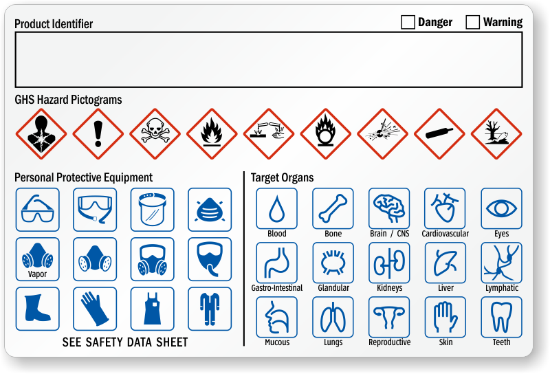 Fill out pertinent information on this write-on GHS label to communicate accurate chemical information. Add chemical name, choose relevant signal header, encircle chemical hazards, mark appropriate PPE to wear, and add additional useful information about a chemical.