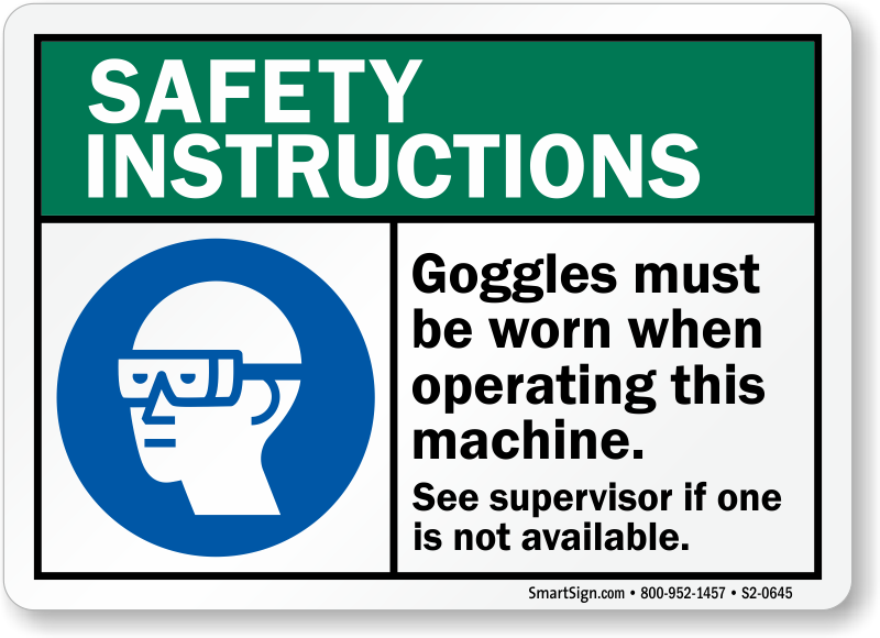 OSHA Safety Instructions Sign: Goggles Must Be Worn When Operating This Machine, See Supervisor If One Is Not Available (With Graphic) S2-0645