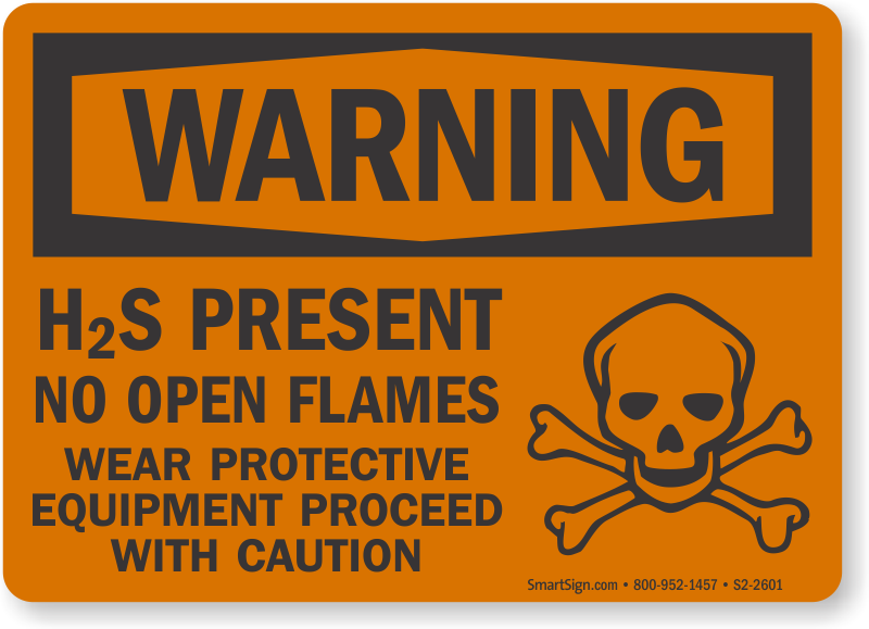 OSHA Warning Sign: H2S Present - No Open Flames, Wear Protective Equipment, Proceed With Caution