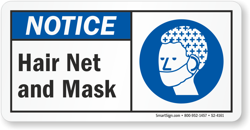 Keep the sources of physical contaminants away by warning individuals to wear hair net and mask with this ANSI Notice Sign.
