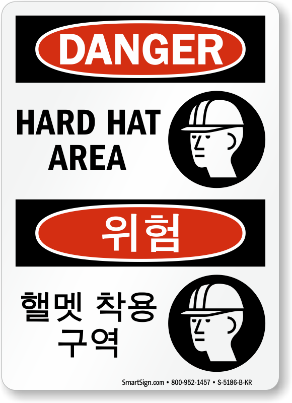 Safeguard your workers with a safety message in English as well as Korean. Deploy this sign and communicate the importance of wearing Hard Hats in the area. A relevant graphic is also featured.
