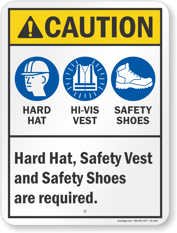 ANSI Caution Sign: Hard Hat, Safety Vest And Safety Shoes Are Required K2-4484
