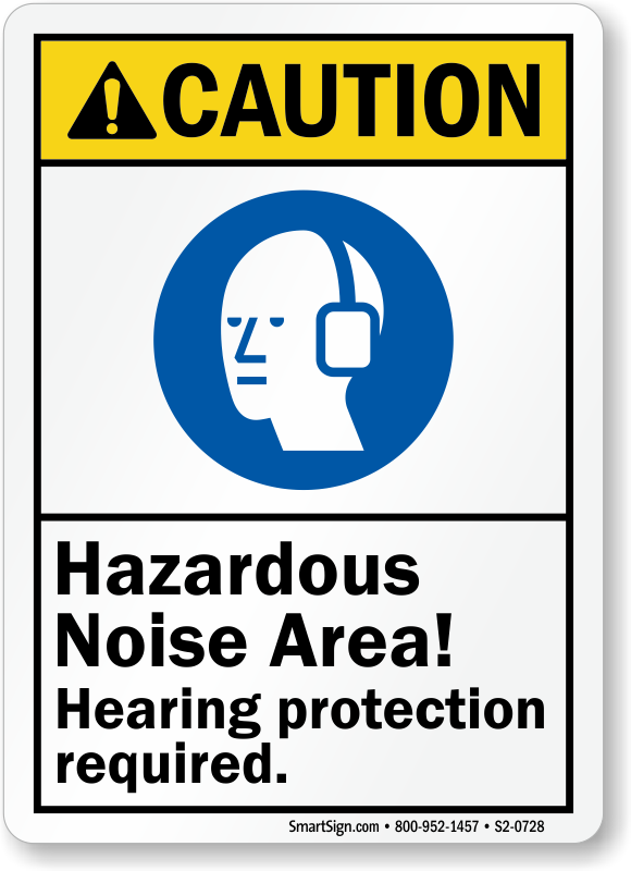 ANSI Caution Sign: Hazardous Noise Area, Hearing Protection Required (With Man Wearing Ear Muffs Graphic)
