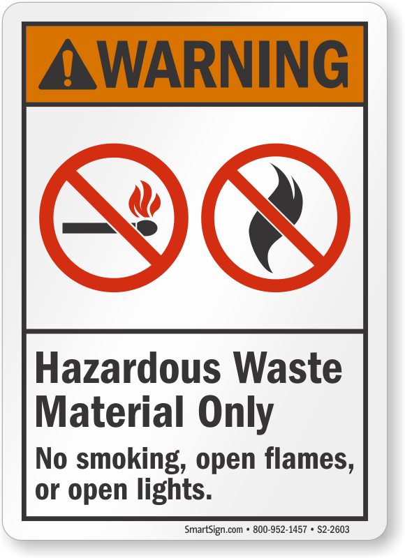 ANSI Warning Sign: Hazardous Waste Material Only - No Smoking, Open Flames, Or Open Lights