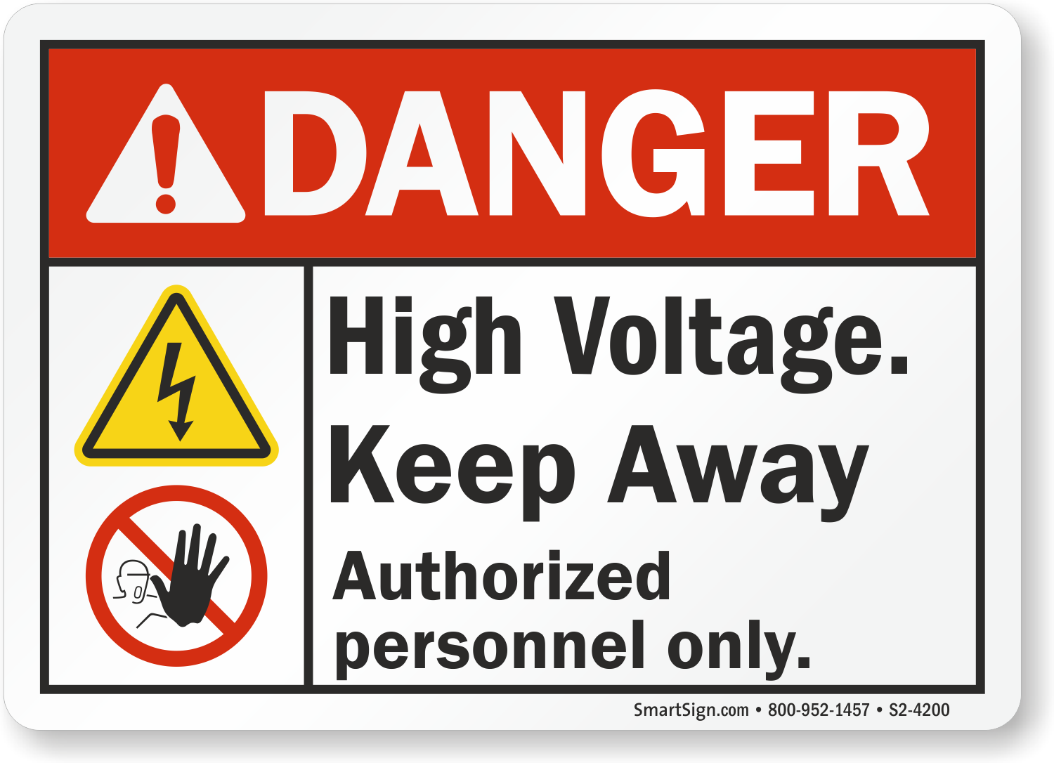 ANSI Danger Sign with ISO lightning bolt symbol and no access for unauthorized symbol clearly marks high voltage equipment or areas.