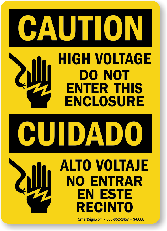 Electrical room, server room, equipment room, and other high voltage areas should be marked with a Bilingual OSHA Caution Sign like this.
