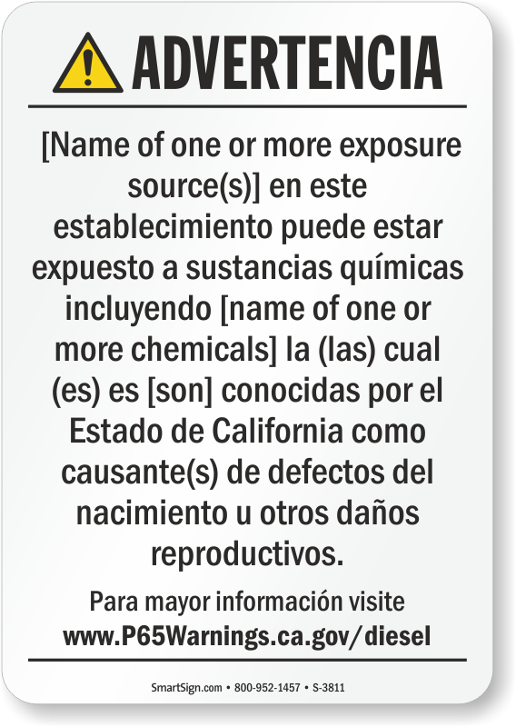 Spanish California Prop 65 Hotel Sign warns guests, especially pregnant women at the hotel against exposure to listed reproductive toxicants.