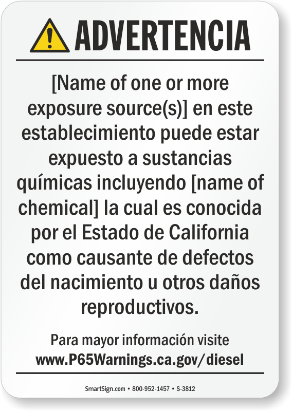 Spanish California Prop 65 Hotel Sign warns guests, especially pregnant women at the hotel against exposure to a single reproductive toxicant.