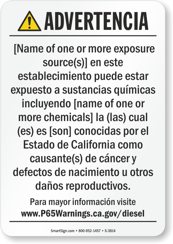 Spanish California Prop 65 Hotel Sign warns guests, especially pregnant women at the hotel against exposure to all the chemicals listed as both carcinogens and as reproductive toxicants.