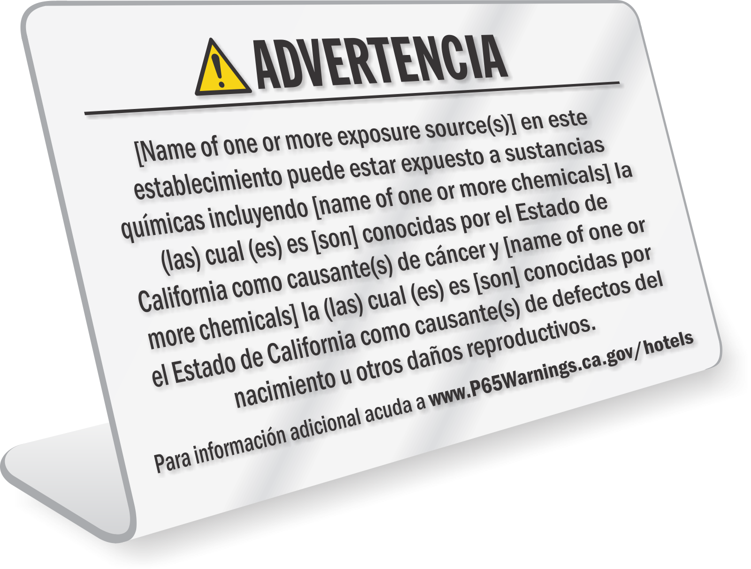 Spanish California Prop 65 Hotel Sign warns guests, especially pregnant women at the hotel against exposure to all the listed carcinogens and reproductive toxicants.