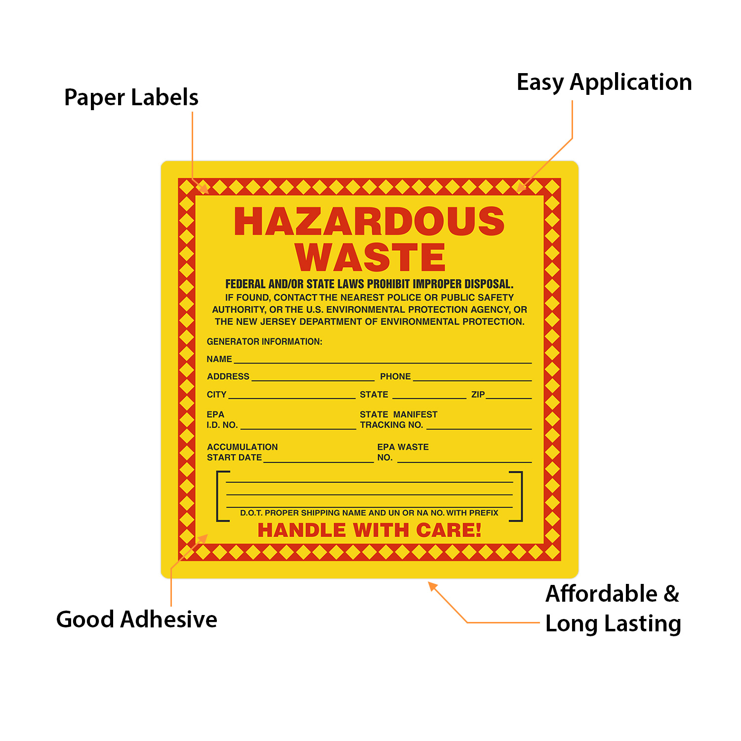 - Hazardous Waste Labels list telephone numbers for quick reference during an emergency.
