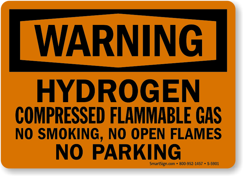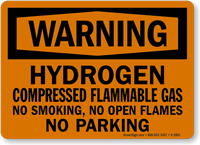 Help workers take necessary precautions near highly flammable Hydrogen gas. Install this OSHA Warning Sign to caution everyone that smoking, open flames, and parking is prohibited in the vicinity.