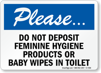 Feminine Hygiene Products Sign: Please, Do Not Deposit Feminine Hygiene Products Or Baby Wipes In Toilet S-7356