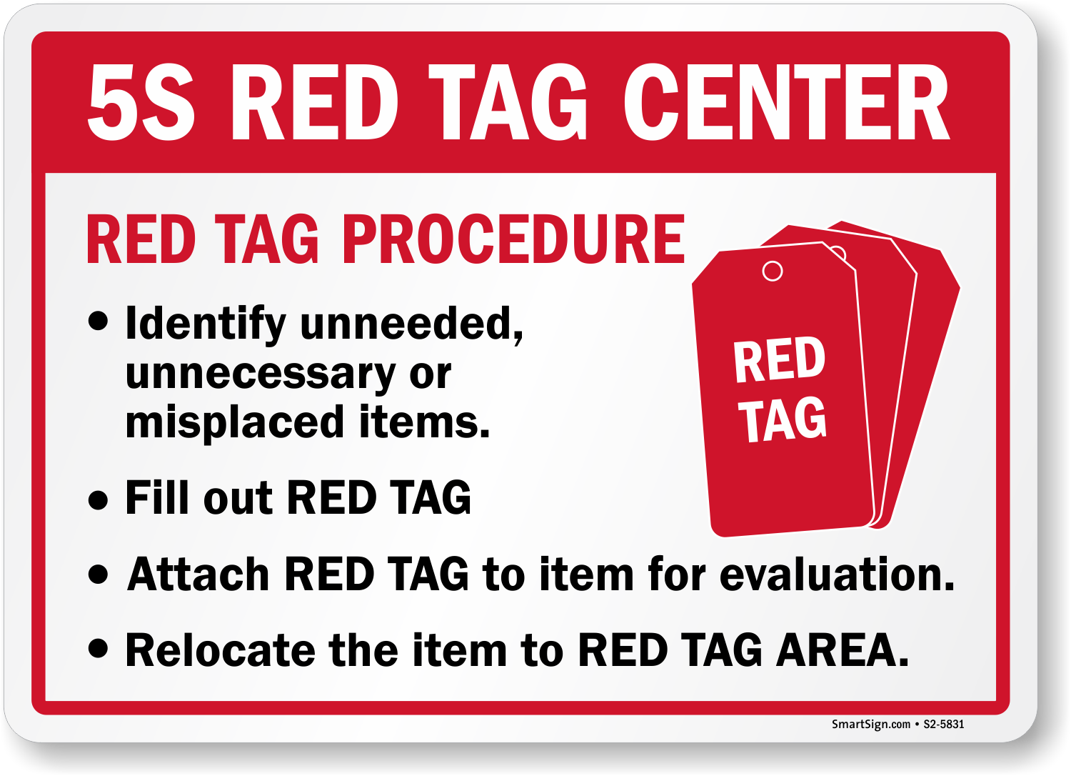 Streamline evaluation and relocation with this 5S Red Tag Center sign, guiding teams in identifying and processing unneeded items.