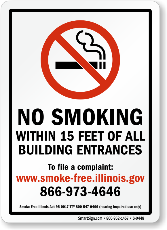 Illinois No Smoking Sign: No Smoking Within 15 Feet Of All Building Entrances To File A Complaint: Www.Smoke-Free.Illinois.Gov 866-973-4646 Smoke-Free Illinois Act 95-0017 Tty 800-547-0466 (Hearing... S-9448