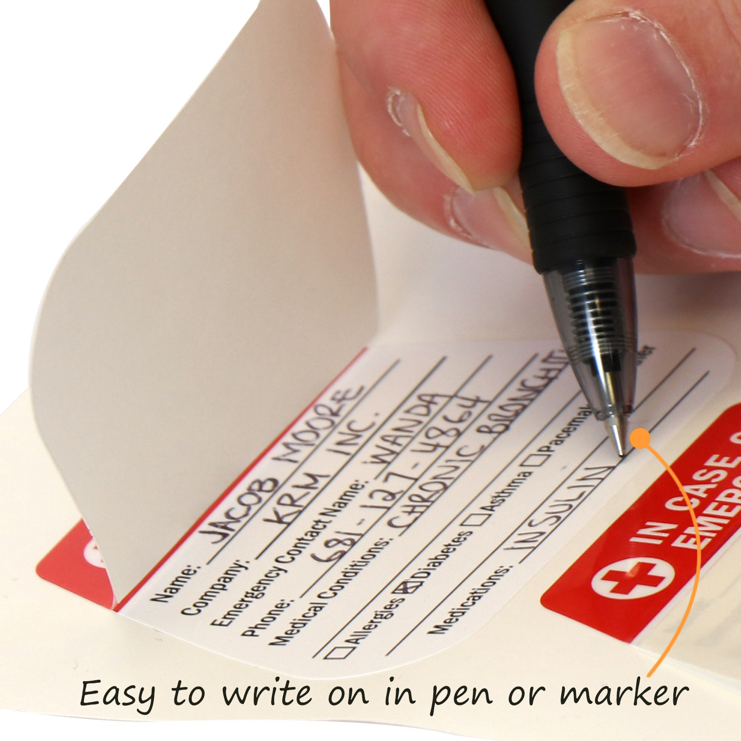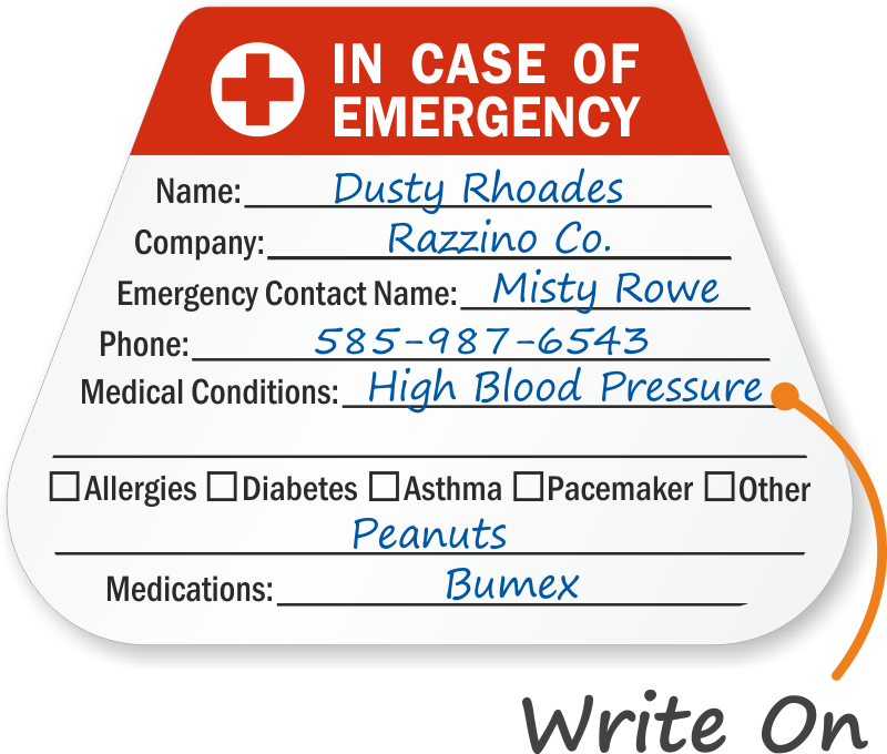 This Hard Hat Decal informs everyone of specific medical condition like 'high blood pressure' or 'asthma' and other details about the employee, in case of emergency.