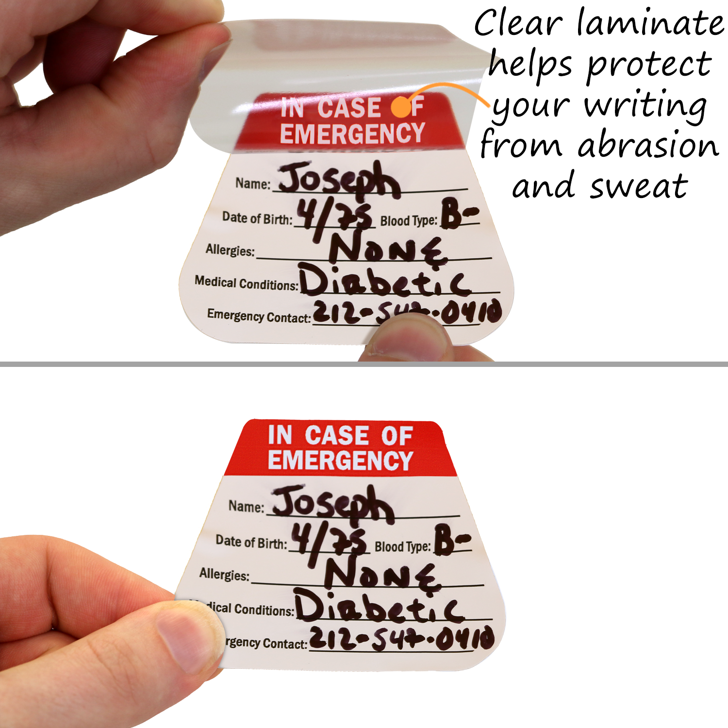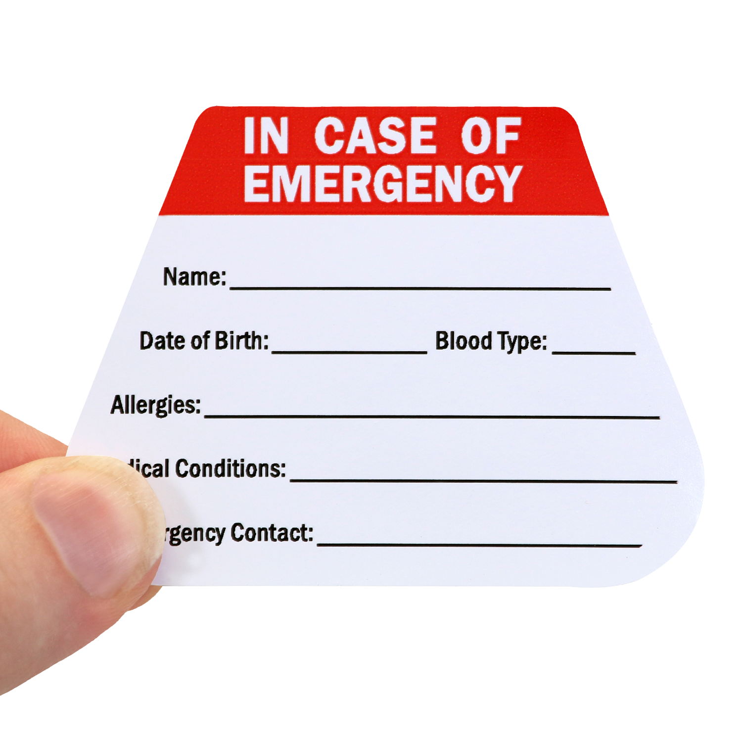 Ensure first responders can quickly locate vital information like name, blood type, allergies, medical conditions, and more on this 'In Case Of Emergency' Hard Hat Label.Â
