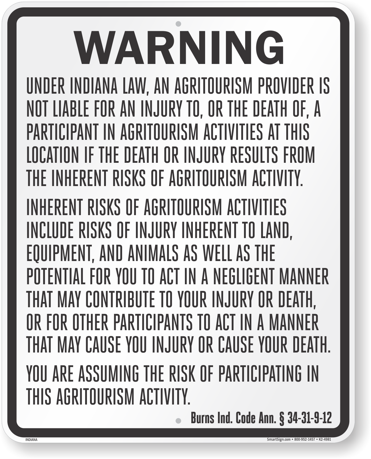 Indiana Agritourism Liability Sign: Warning - Under Indiana Law, An Agritourism Provider Is Not Liable For An Injury To, Or The Death Of, A Participant In Agritourism Activities At This Location... K2-4981 Learn More...
