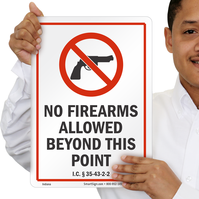 Post this Gun Control Sign on entrances and other points of access to inform people that firearms are not allowed on your premises. The sign is pursuant to Indiana code section Ann. § 35-43-2-2.