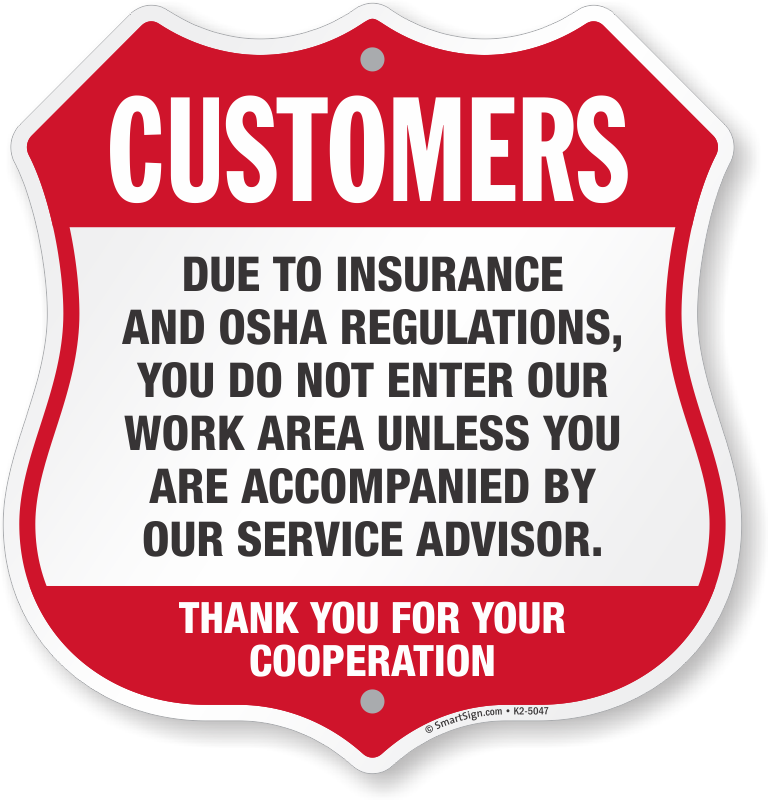 Restricted Area Shield Sign: Customers - Due To Insurance & OSHA Regulations, Please Do Not Enter Our Work Area Unless You Are Accompanied By Our Service Advisor K2-5047 Learn More...