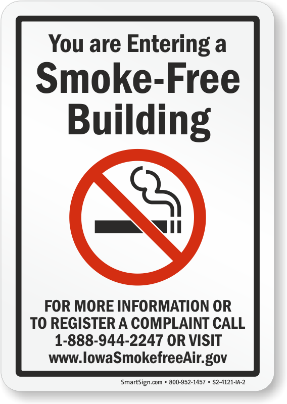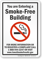 The Smokefree Air Act requires businesses to post “no smoking” signs at every entrance that “clearly and conspicuously” inform persons that they are entering an area where smoking is prohibited, including entrances to outdoor serving and seating areas and in all vehicles owned, leased, or provided by an employer. Our Iowa You Are Entering A Smoke-Free Building Sign contains the telephone number for reporting complaints and the official website: www.IowaSmokefreeAir.gov.