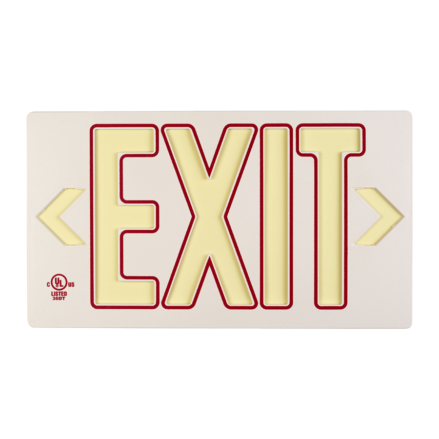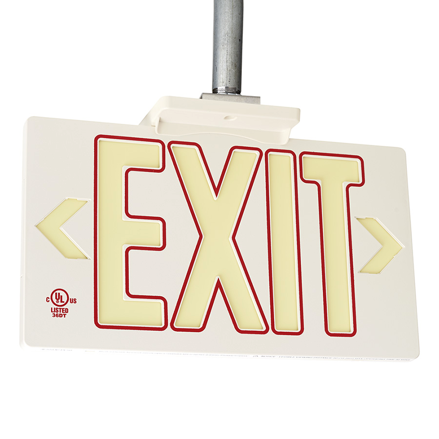 Molded Plastic Exit Sign: Photoluminescent White w/Red Molded Exit Sign with Universal Mount Canopy: Visible at 50 feet or 100 feet EXIT-7007