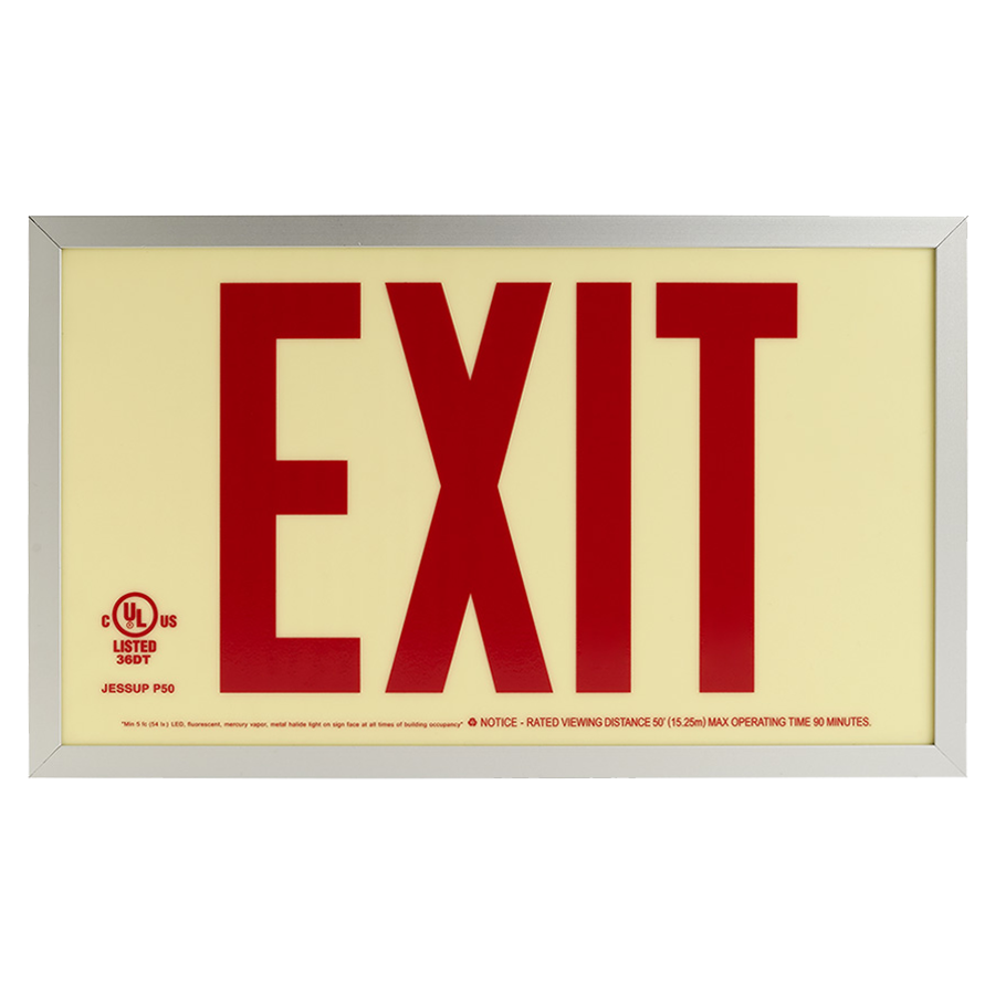 Aluminum Exit Sign: Photoluminescent Red Aluminum Exit Sign with Universal Mount Canopy: Visible at 50 feet or 100 feet EXIT-7014