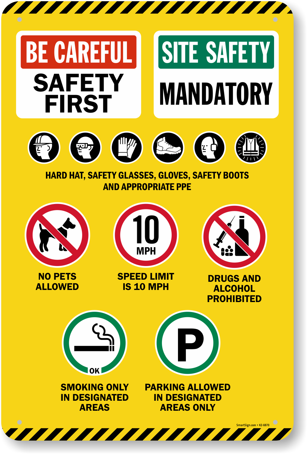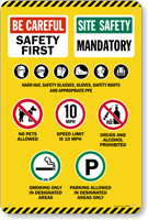 A Jobsite Construction Safety Sign uses bullet points to make workers, contractors, etc. more aware. This sign emphasizes PPE wear, speed limit, prohibited items, no pets, and special designated areas.