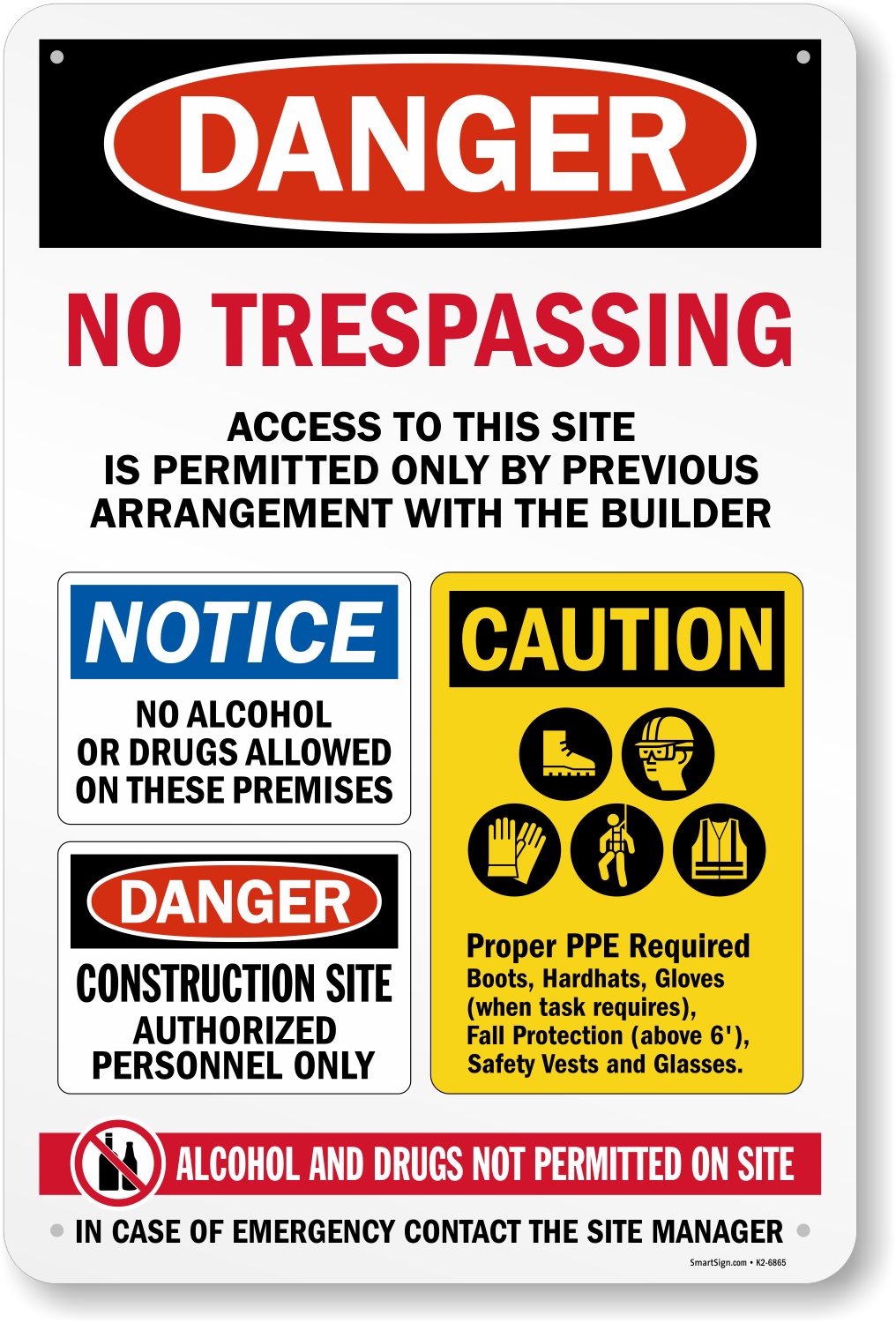 A Jobsite Construction Safety Sign uses bullet points to make workers, contractors, etc. more aware. This sign emphasizes alcohol and drug notices, PPE, and danger.