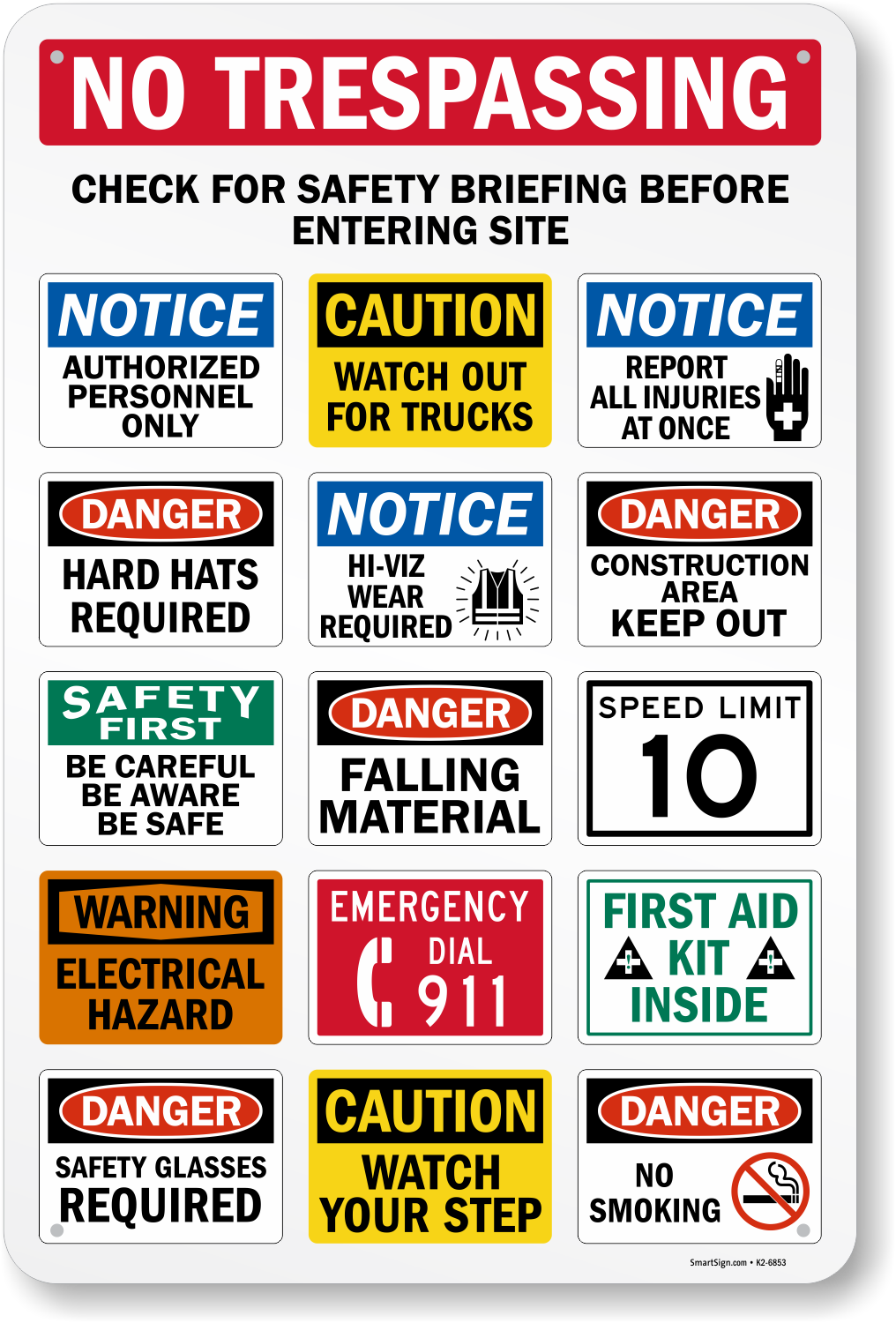 A Jobsite Construction Safety Sign uses bullet points to make workers, contractors, etc. more aware. This sign emphasizes amongst other safety signs, speed limits, watch your step, PPE, watch out for trucks, and more.
