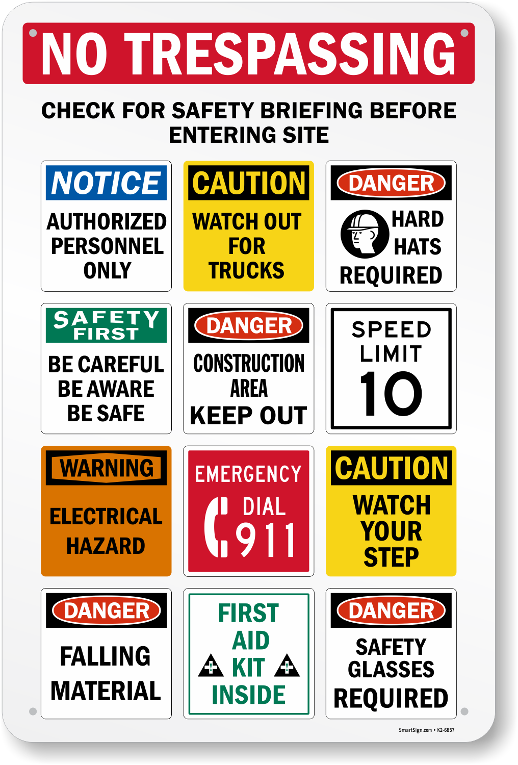 A Jobsite Construction Safety Sign uses bullet points to make workers, contractors, etc. more aware. This sign emphasizes amongst other safety signs, speed limits, hard hats requried, keep out, watch out for trucks, and more.