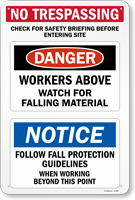 A Jobsite Construction Safety Sign uses bullet points to make workers, contractors, etc. more aware. This sign emphasizes watch for falling material and follow fall protection guidelines.