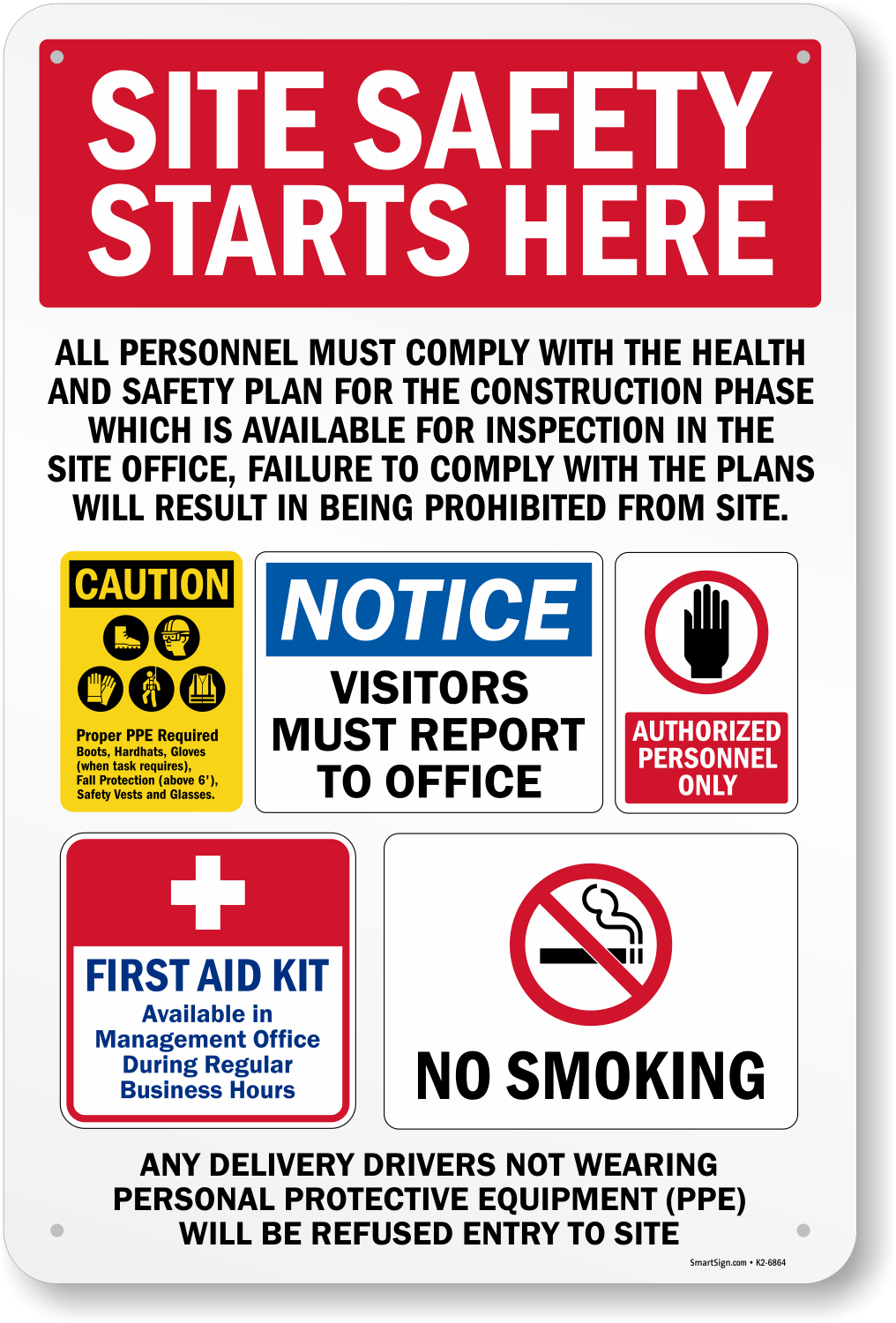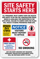 A Jobsite Construction Safety Sign uses bullet points to make workers, contractors, etc. more aware. This sign emphasizes authorized personnel only, PPE, and drugs and alcohol being prohibited on premises.