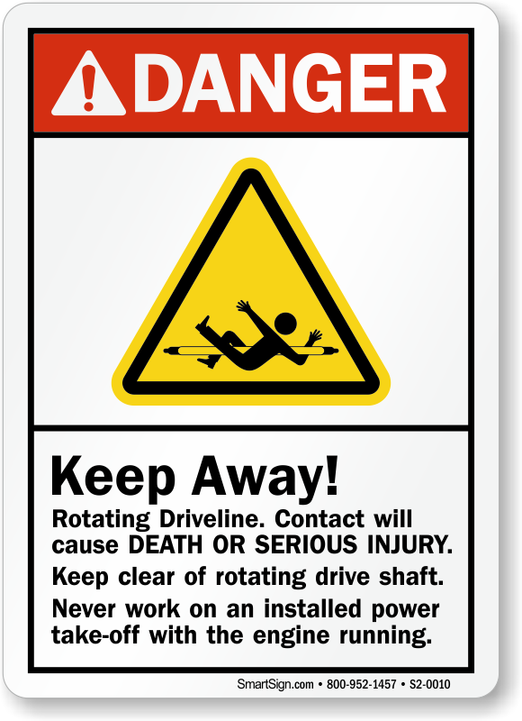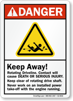Rotating drivelines of the crane can entangle those working closeby and cause death or serious injury. Warn them to stay clear of the driveline with this ANSI Crane Danger Sign.