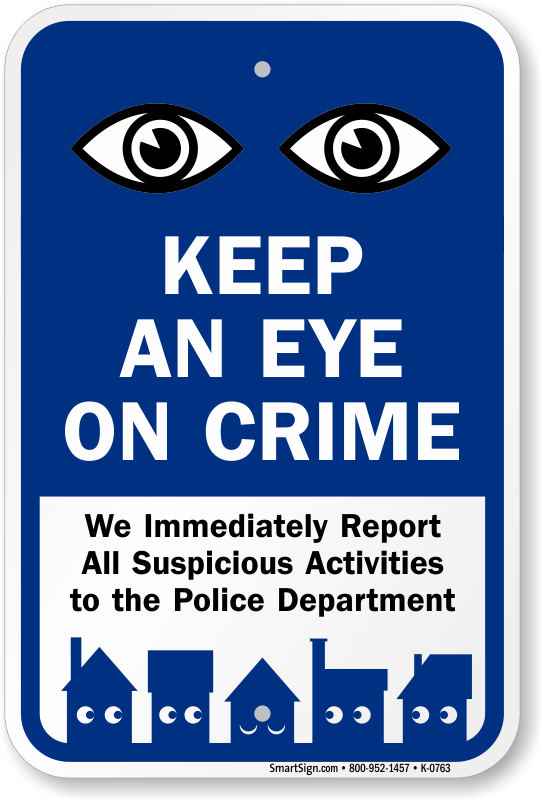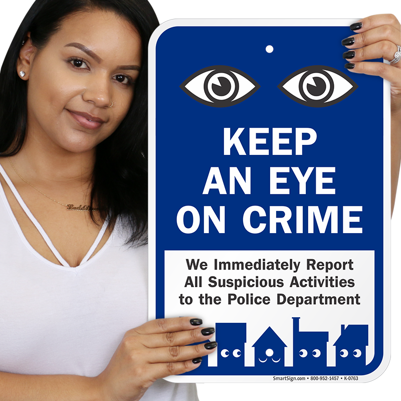 Neighborhood Crime Watch Sign: Keep An Eye On Crime, We Immediately Report All Suspicious Activities To The Police Department K-0763 Learn More...