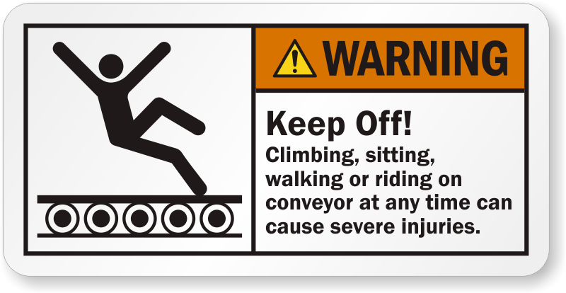 Conveyors are useful but also full of dangers. Use this ANSI label to ensure that activities such as climbing, sitting, walking or riding are forefended.