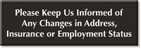 Select-a-Color Engraved Sign: Please Keep Us Informed Of Any Changes In Address, Insurance Or Employment Status SE-5499