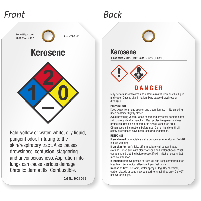 Find hazard ratings for Kerosene in both—GHS and NFPA format—in one tag. Plastic built make these tags sturdy and difficult to tear. Tags can be easily tied to a container.