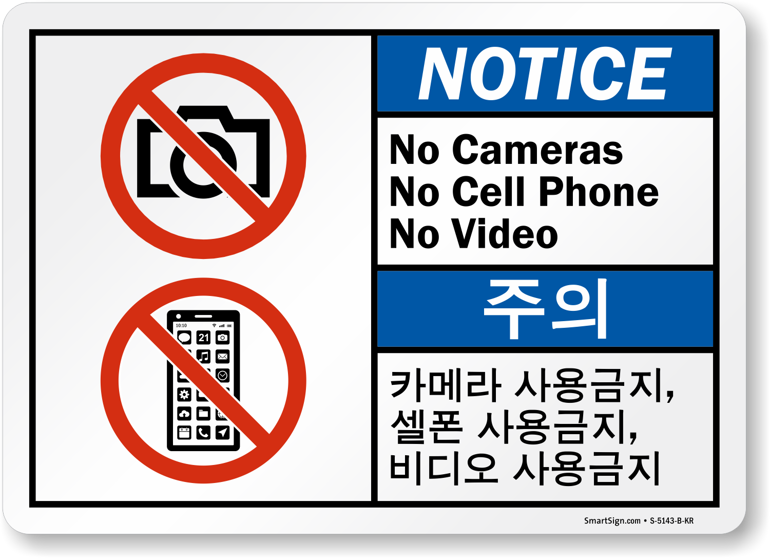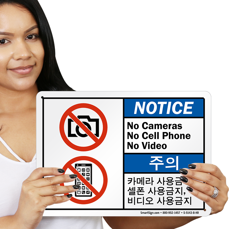 Ideal for your bilingual workforce, this ANSI Notice Prohibition sign with its message in English and Korean prohibits the use of cameras, cell phones or video in the premises.