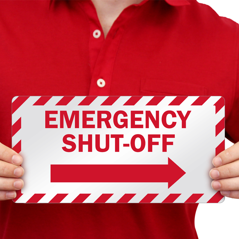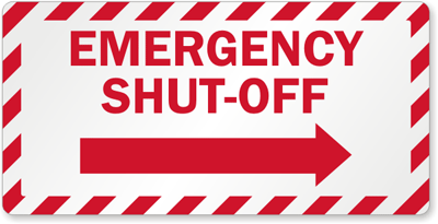 Guide users instantly with our 'Emergency Shut-Off' Sprinkler Label, featuring a bold design and pointing arrow. Durable and easy to apply for quick and effective safety communication.