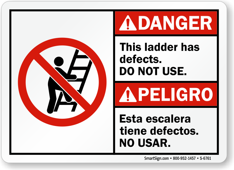 With message in two languages and a clear pictogram, this ANSI Danger/Peligro Ladder sign will promote safety in your facility. Post it to keep workers from using a defected/broken ladder.